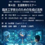 2026年1月7日 / 最終更新日時 : 2026年1月7日 情報委員 お知らせ大臨工 勉強会・セミナー教育 2025年度 第4回生涯教育セミナー 2025年度 第4回生涯教育セミナー テーマ:「臨床工学技士のための生成AI活用」 開 催 日:2026年2月6日(金) 開催時間:19:00~20:45(内15分質疑応答) 開催形式:Web(Zoom Webinars) 参 加 費:会員・学生:無料、非会員:1,000円