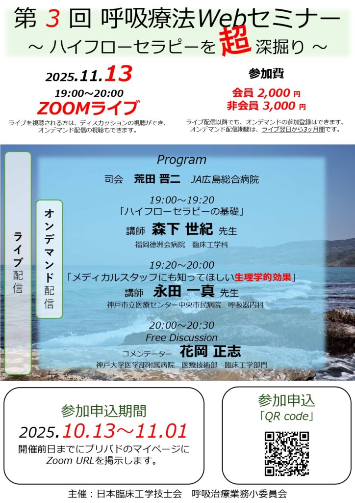 呼吸療法に関連した一つのテーマについて基礎的な内容から専門的な内容について講義していただき、講義の最後にディスカッションのコーナーをもうけ、テーマについてディスカッションし、応用力を身につけることを目的としたセミナーです。今回は、「ハイフローセラピーを超深掘り」というテーマとさせていただきました。プログラムは、はじめに臨床工学技士の森下先生から「ハイフローセラピーの基礎」について、次に医師の永田先生から「メディカルスタッフにも知ってほしい呼吸生理学的効果」についてご講演いただきます。ここまではライブ配信・オンデマンド配信の両方とも視聴できますが、最後のFree Discussonはライブ配信をご視聴いただける方のみの特典となっております。なお、ライブ配信が終わった後、オンデマンド配信の申し込みが開始され、3ヶ月間のオンデマンド配信が行われます。ライブ視聴をされた方はオンデマンド配信も視聴できますので、講義の復習にもお役立てください。宜しくお願い致します。